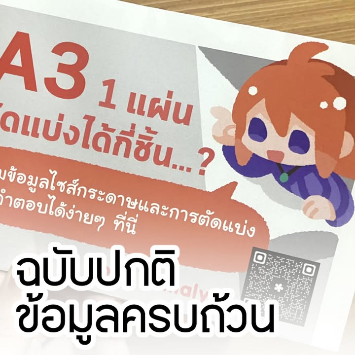– ด้านหลังให้คำตอบว่า 1A3 ตัดแบ่งขนาดต่างๆ ได้กี่ชิ้น แสดงเป็นแผนภาพชัดเจน ไม่งงแน่นอน! (แต่ถ้าจะพิมพ์จริงเมื่อไหร่ ถามข้อมูลจากร้านเพื่อความมั่นใจก็ดีนะ)