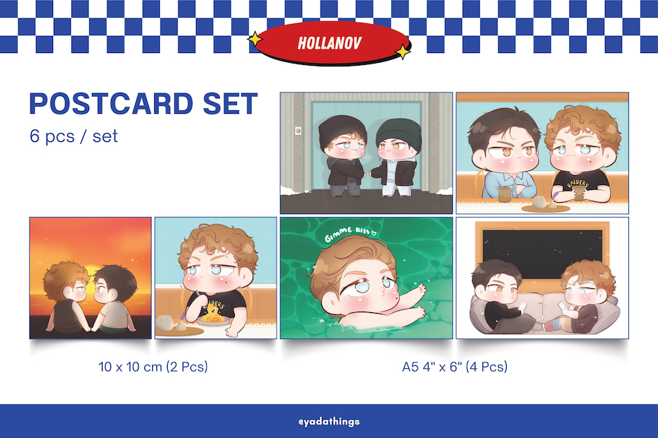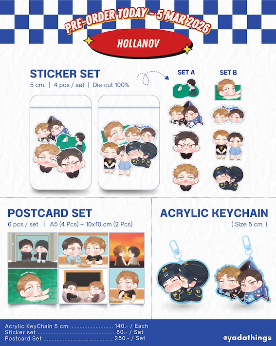ผู้จัดทำ : yadathings ลักษณะสินค้า: Sticker Set Die-cut 100% | Postcard Set A5 + 10×10 cm. | Acrylic KeyChain 5 cm. Fandom : HOLLANOV (HEATED RIVALRY)